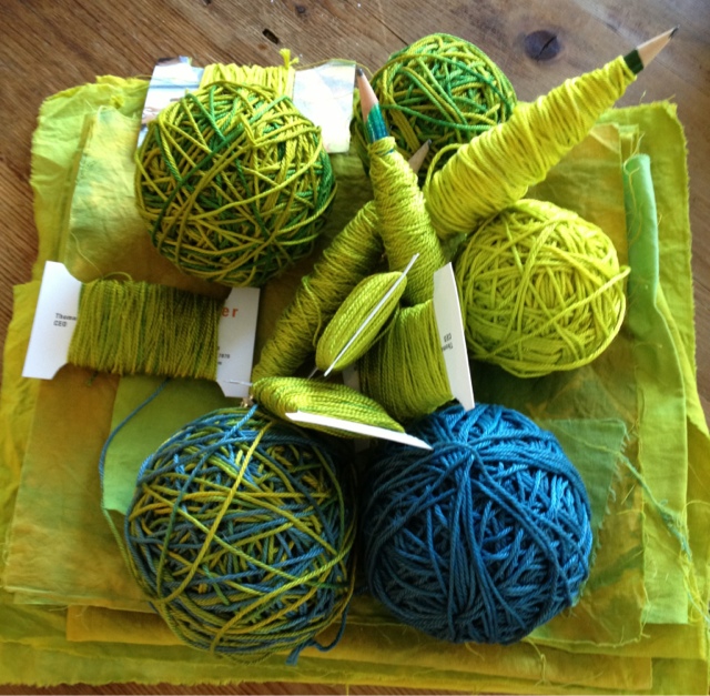 Next I wrapped sections of about 20 threads in what I hoped would end up as a single organic shape, and overdyed them in cerulean blue (to get a nice chartreuse to green gradation.)